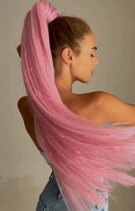 - Clip the glitter strands into a ponytail or bun and then wrap the extensions around the velcro band to secure them in place.