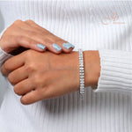 - Tennis bracelet featuring Oval?4mm AAA+ cubic zirconia stones in four-prong basket settings. Measures 6.5 inches in Length?stainless steel?