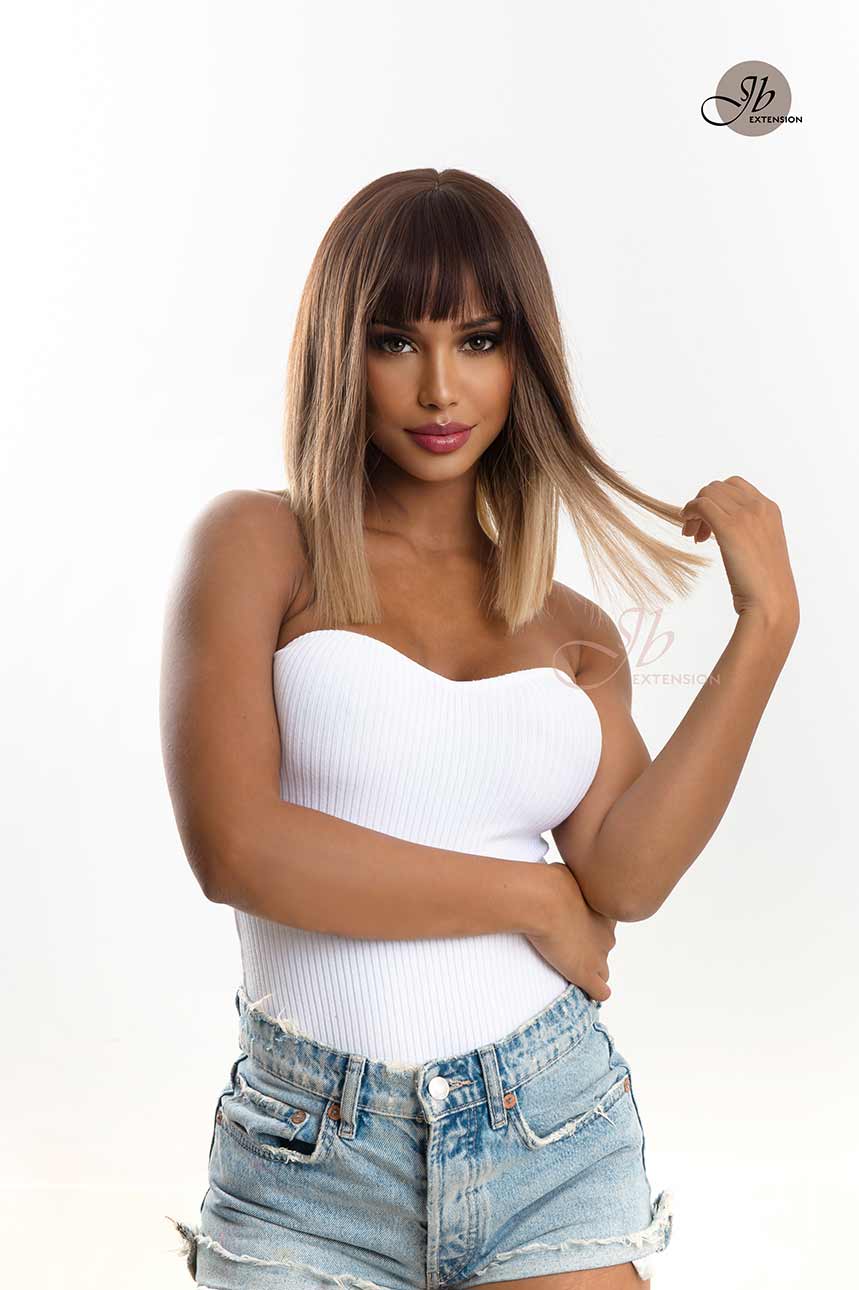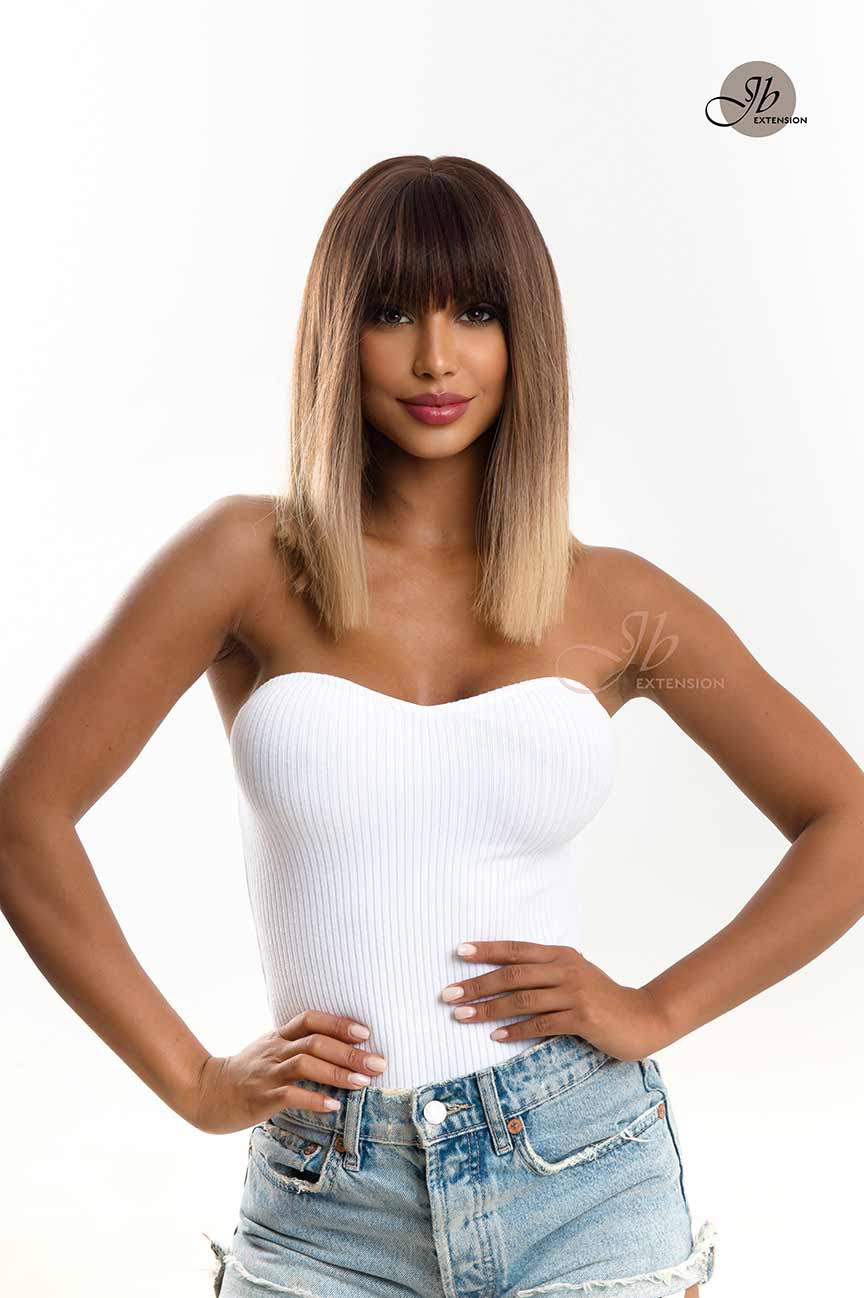 JBEXTENSION Pelucas ombré rectas JESSY de 15 pulgadas para mujer, raíz negra con pelo marrón, pelucas sintéticas con flequillo Romo