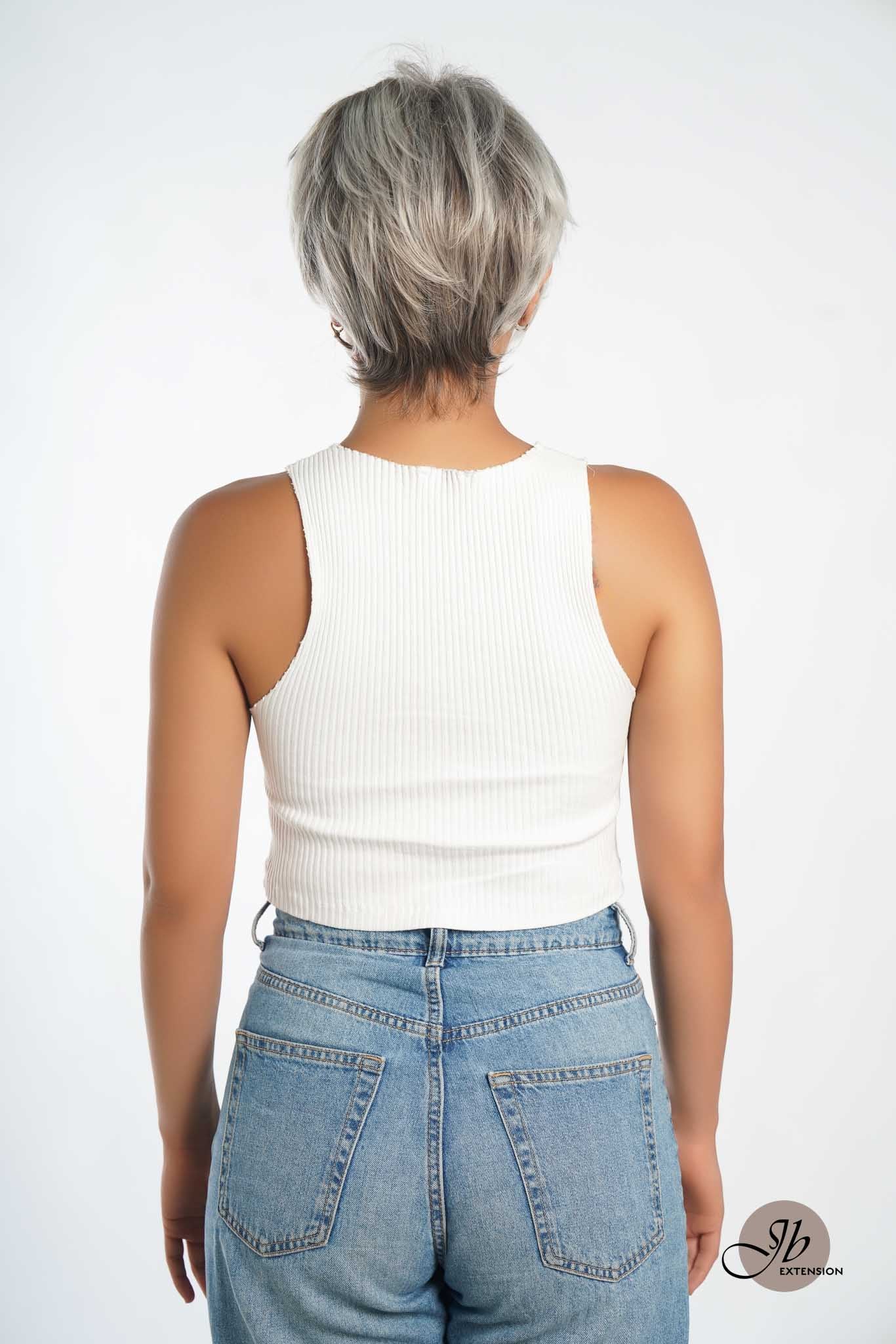 JBEXTENSION Pixie Cut Grey Silver Half Real Human Hair Half Futura Fiber Fashion Women Wig LINDA